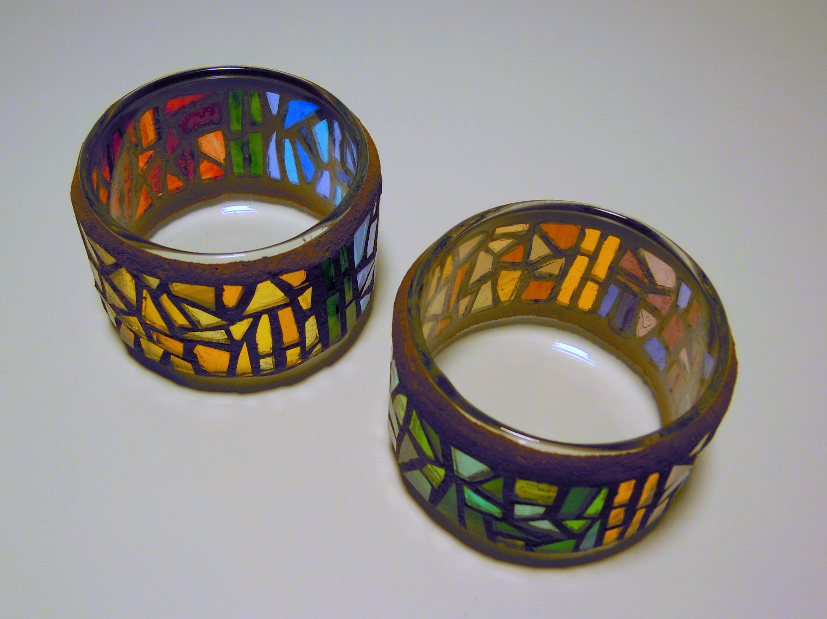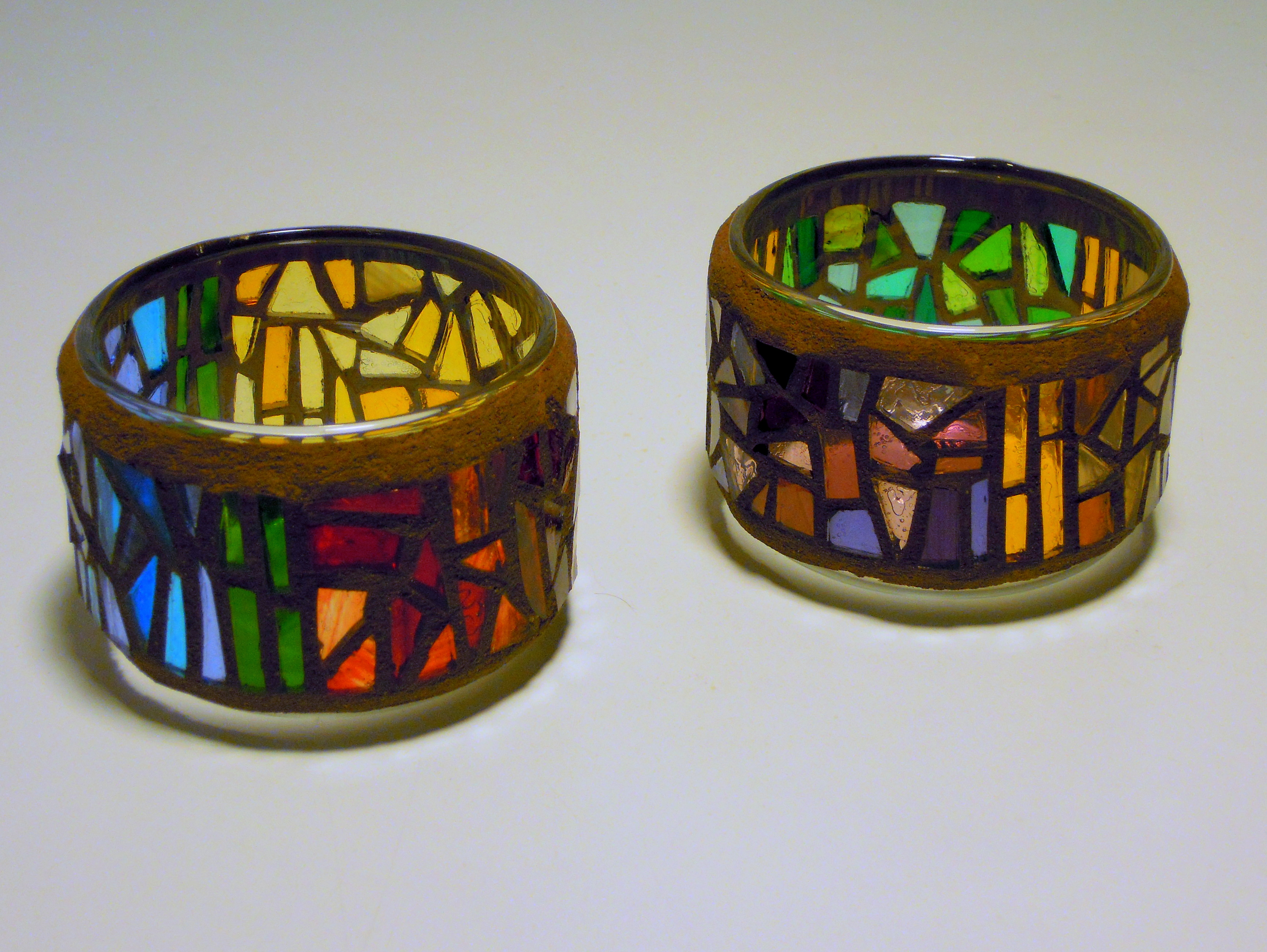 As soon as the grout on these little tealight holders cured, I wanted to see how they looked with candles. But where were my tealights? A frantic search ensued. I checked all the logical places (storage box with other candles, craft drawer) and then all the illogical places (stash of mosaic supplies, freezer, under the kitchen sink). Nothing.